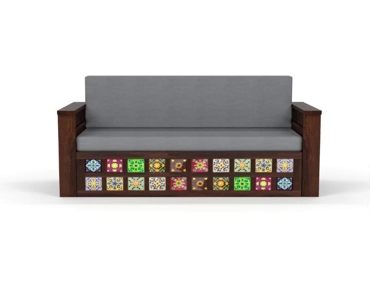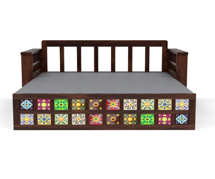 This solid wood sofa cum bed from COSMOS features a unique headboard design and comes with a 1 year warranty.  it easily converts into a comfortable bed for guests. Made from Sheesham wood, it brings a touch of elegance and durability to your living space.