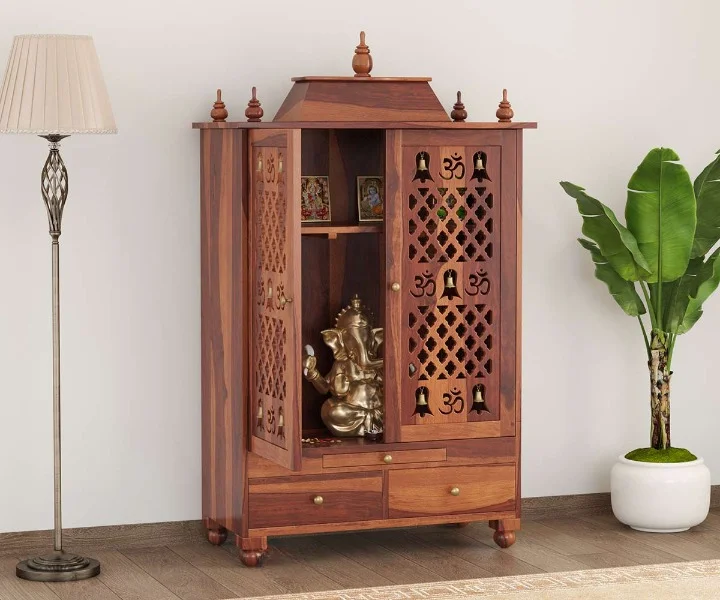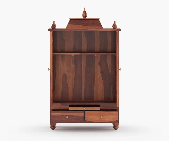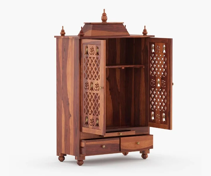 1.Om Sheesham is a traditional design of a home temple. The top of the unit is made in a triple layer with a small dome-like pattern at various spots. It has two doors in front, which are further indented with curio design. A pull-out tray and a drawer follow the temple. Legs are carved with curly brackets at the inverted sides.