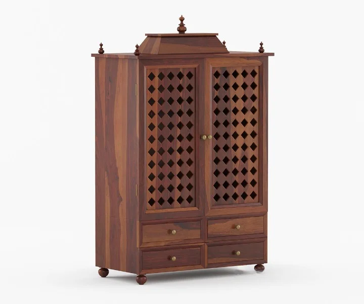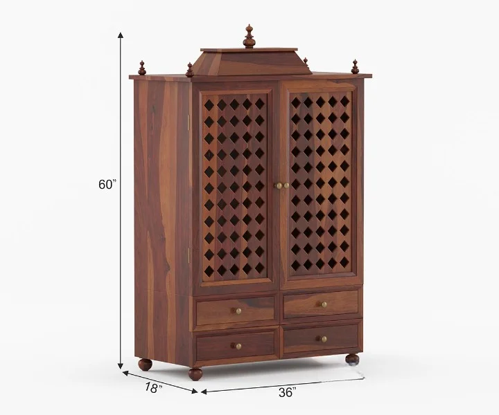 1.Shree is a traditional design of a home temple. The top of the unit is made in a triple layer with a small dome-like pattern at various spots. It has two doors in front, which are further indented with curio design. A pull-out tray and a drawer follow the temple. Legs are carved with curly brackets at the inverted sides.