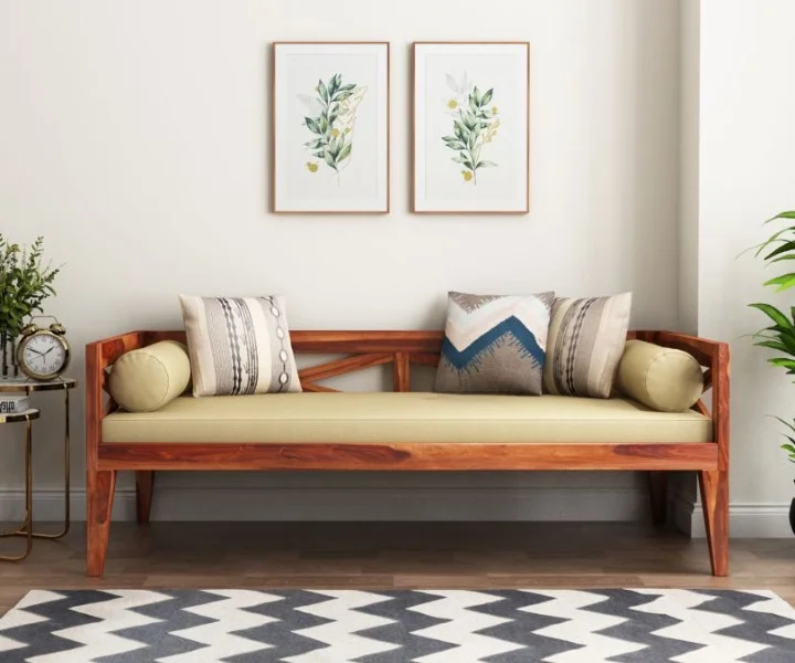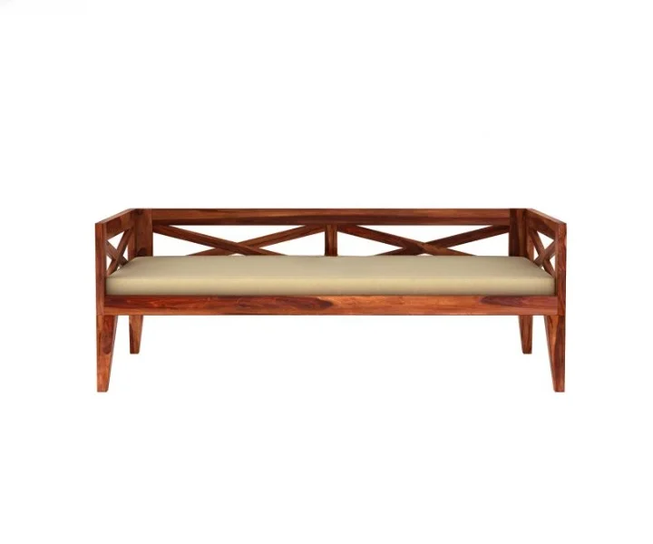 Wooden divan signifies a contemporary and rustic furniture shape. Its backrest and sides involve geometrically shaped panels while the tapered legs pair beautifully with the furniture.