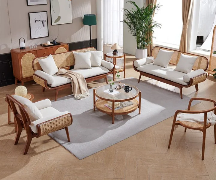 Perfect for both modern and classic interiors, this sofa set is durable, comfortable, and ideal for creating a warm and welcoming living room. wooden sofa set, rattan sofa set, wooden sofa with cushions, modern wooden sofa, wooden furniture for living room.
