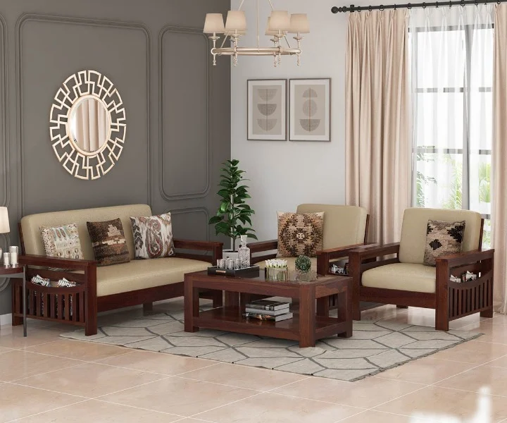 I recently purchased a new wooden sofa set furniture and I have been extremely impressed with its quality and design. The set includes a three-seater sofa, two armchairs, and a coffee table, all made from high-quality solid wood.
